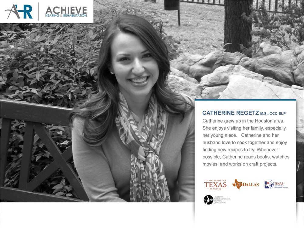 Catherine Regetz, M.S., CCC-SLPCatherine grew up in the Houston area. She enjoys visiting her family, especially her young niece. Catherine and her husband love to cook together and enjoy finding new recipes to try. Whenever possible, Catherine reads books, watches movies, and works on craft projects.Catherine is a licensed and certified Speech-Language Pathologist with expertise in expressive and receptive language impairments and autism spectrum disorders. Catherine is also knowledgeable about how central auditory processing impacts a person’s ability to comprehend and process language, follow directions and sequence information. After working in a preschool program for children with disabilities, Catherine understands the importance of early intervention and coordinating with professionals to positively impact a person’s outcomes in speech therapy. Catherine is interested in helping patients of all ages. Speech Therapy Education B.S. from University of Texas M.S. from The University of Texas at Dallas License Texas Board of Examiners in Speech-Language Pathology Certification American-Speech-Language-Hearing Association (ASHA) |